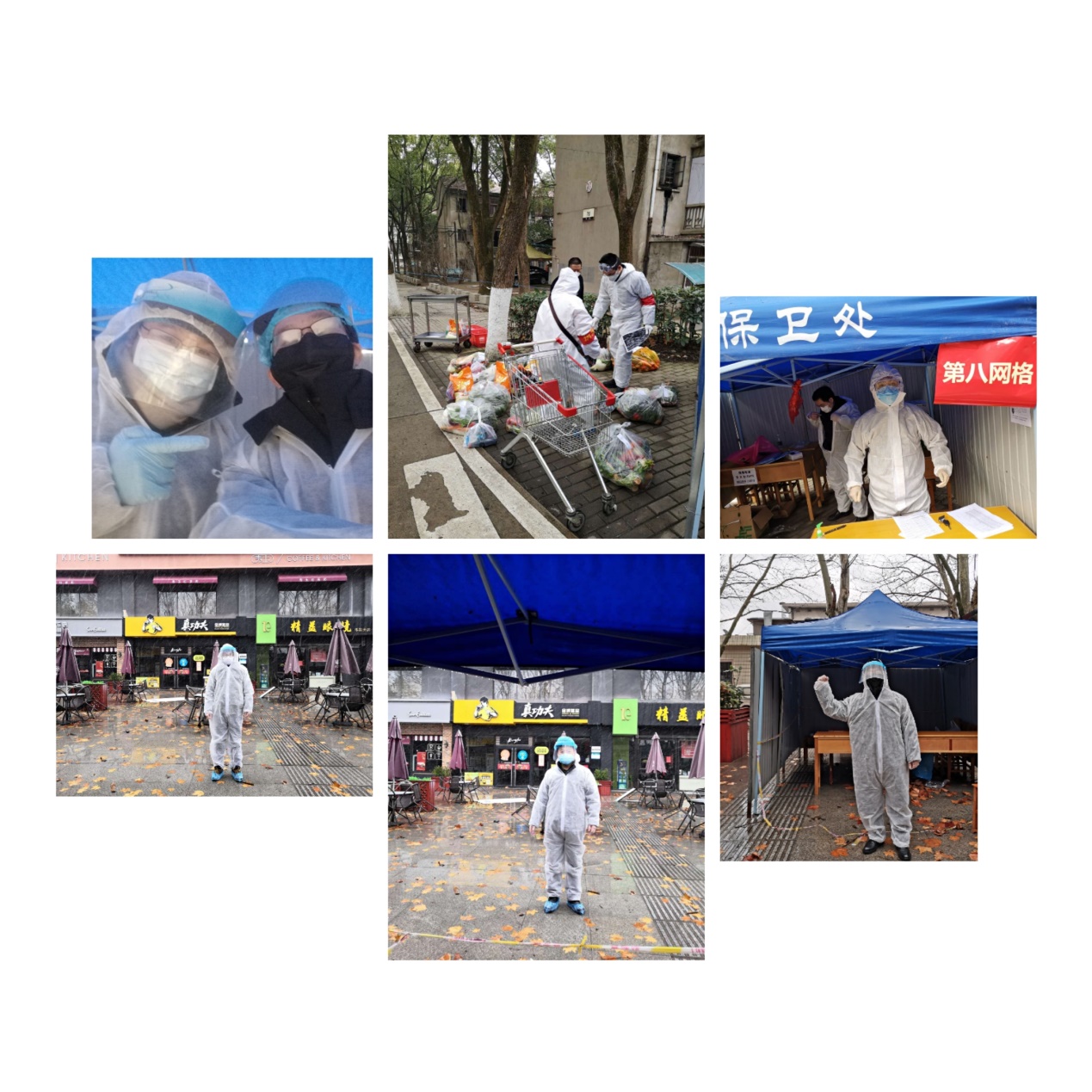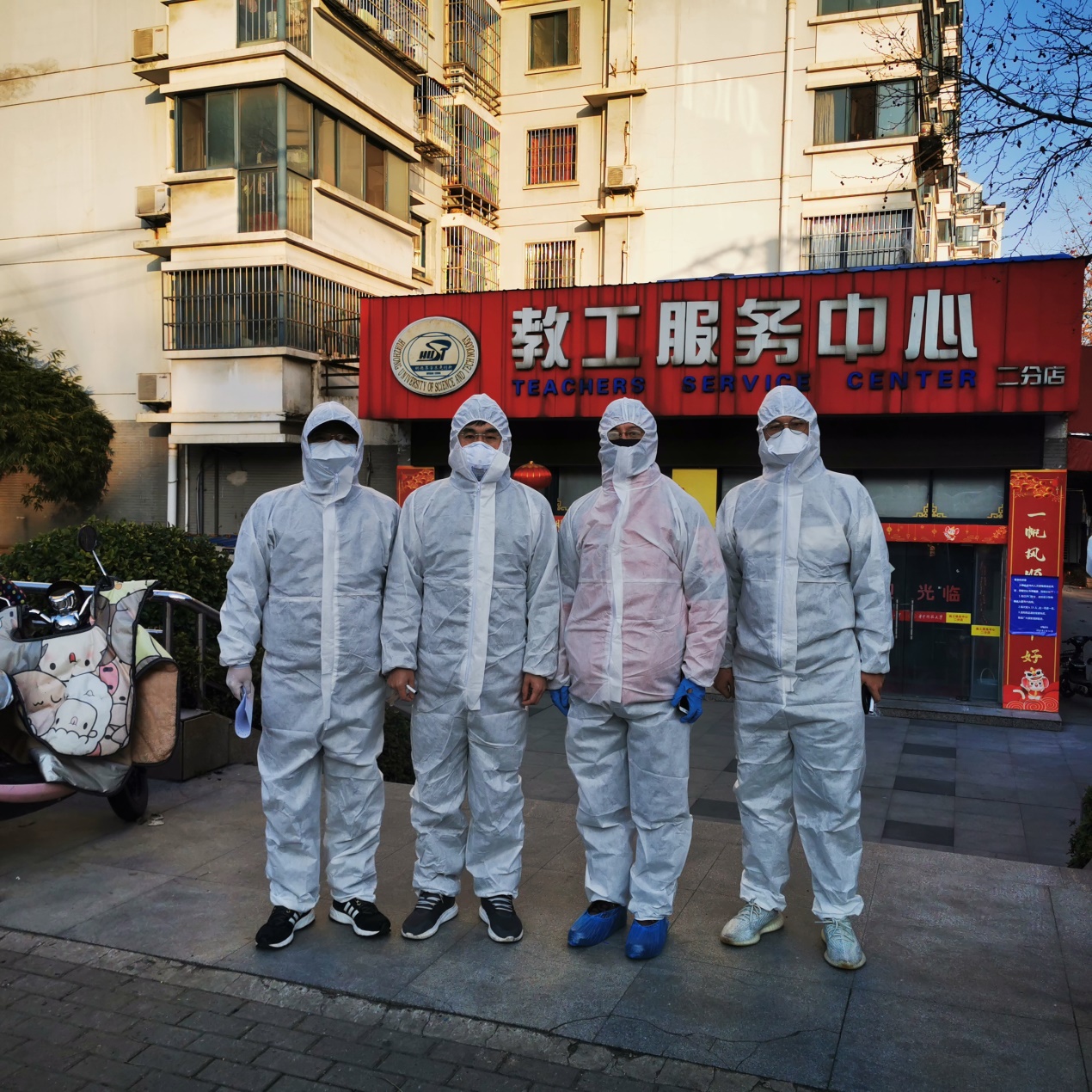 ——下午1点,袁新华、张日华、张文军、王曦四位老师脱下厚厚的防护服,准备交接换班。此时,他们已经在学校家属区第八网格工作了4个小时,落实小区封闭管理要求,为所负责区域内的居民提供送菜、送餐、送药到楼栋门口。此外,还有周华民、樊自田、蒋文海、廖敦明、刘鑫旺、金俊松、黄志高、朱彬、黄安国等老师参与到重点楼栋值守和网格服务工作,他们是风雨中的“逆行者”,以实际行动铸就红色防疫屏障。