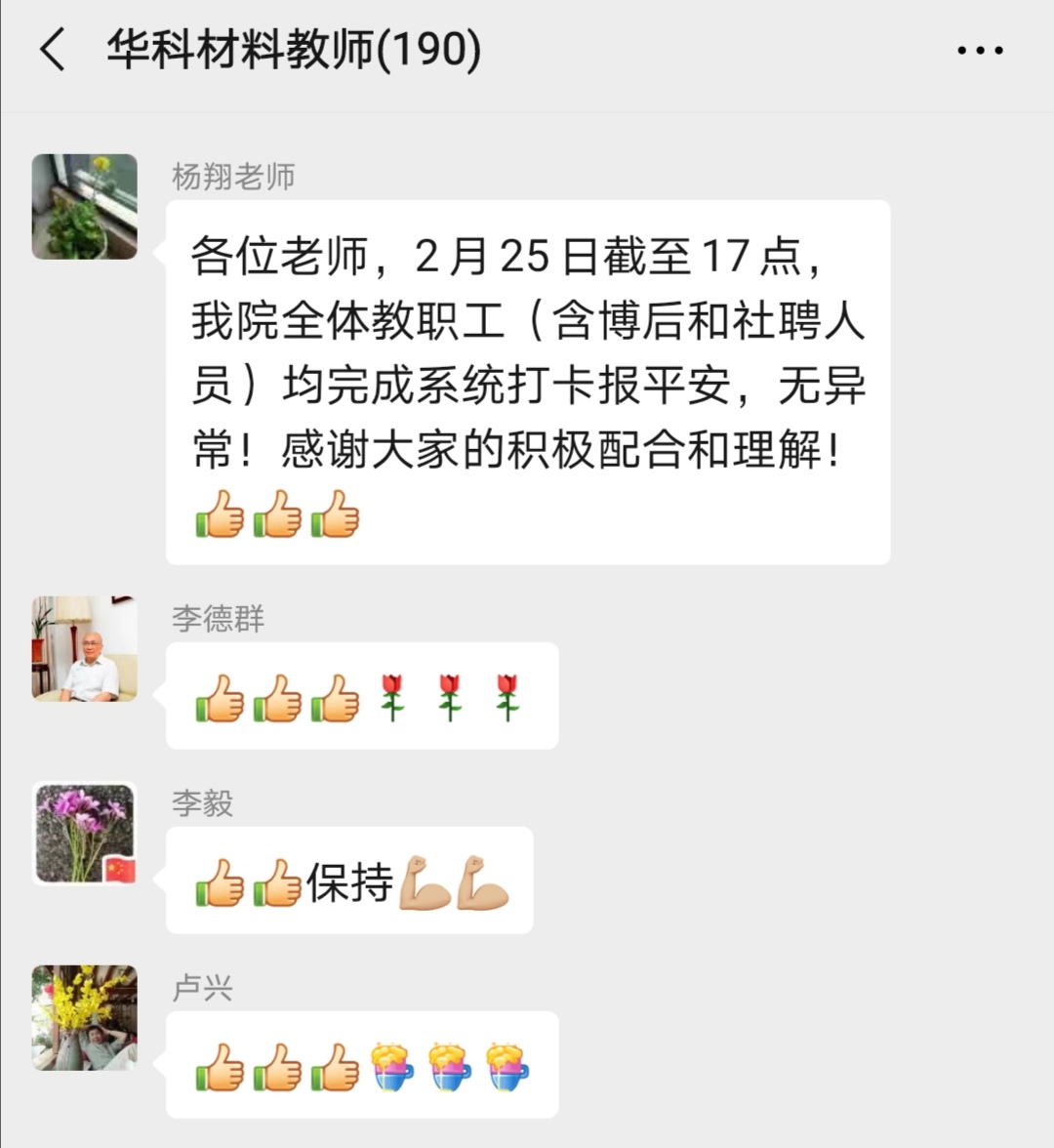 ——上午9点,学院机关党支部微信群响起了温馨提示:“各位老师,新的一天,请大家报平安及在微校园系统填报健康状况,大家开始接龙啦!”这是机关支部书记杨翔开始了每日健康情况信息上报工作。