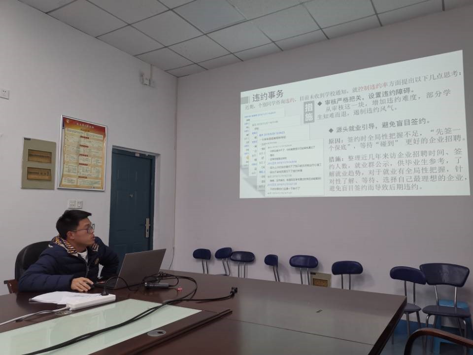 紧接着,纵向就业德育助理钱磊从研究生求职补贴、就业事务、毕业事务、违约办理、支部对接和个人成长方面总结了本学期的工作情况,并就2019届就业质量做了分析报告,让大家受益匪浅。