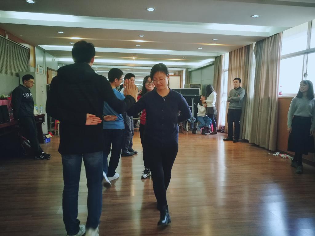 活动在王曦老师进行简短的开场介绍后开始。郭老师首先带领大家在优美抒情的音乐声中用手中的“沙蛋”敲打节拍,现场的气氛顿时活跃起来。紧接着,郭老师和她的助理开始耐心细致地教授同学们华尔兹舞蹈动作,让大家感受华尔兹集体舞式,在舞蹈世界中放松心情,释放内心压力。
