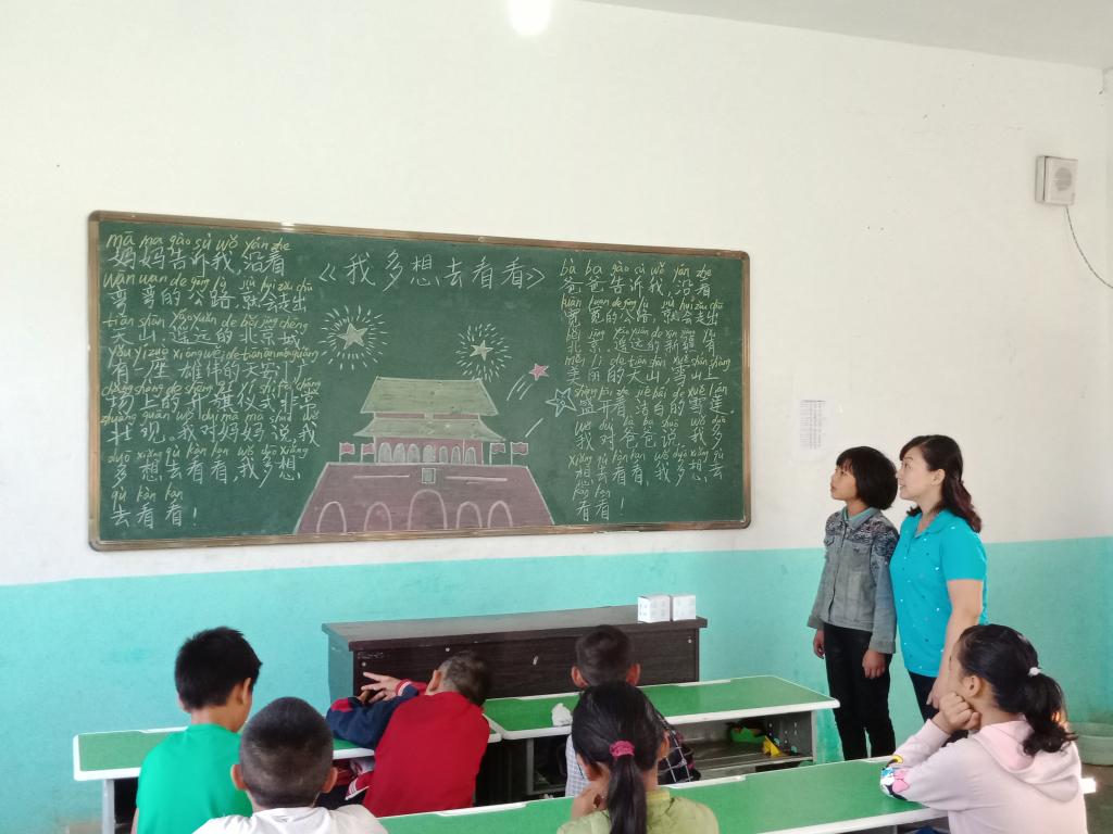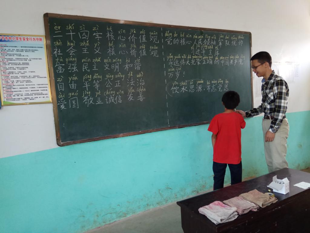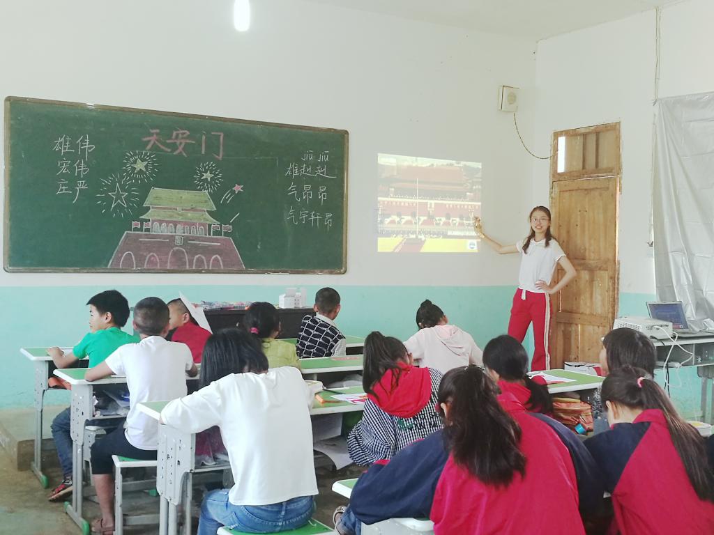 研究生党员陈琳给孩子们观看了天安门广场国庆节阅兵仪式视频,教孩子们画宏伟的天安门。研究生党员杜睿利用晨读时间向三四年级的小朋友讲解社会主义核心价值观以及党的十九大精神,增强孩子们饮水思源不忘党恩的意识。