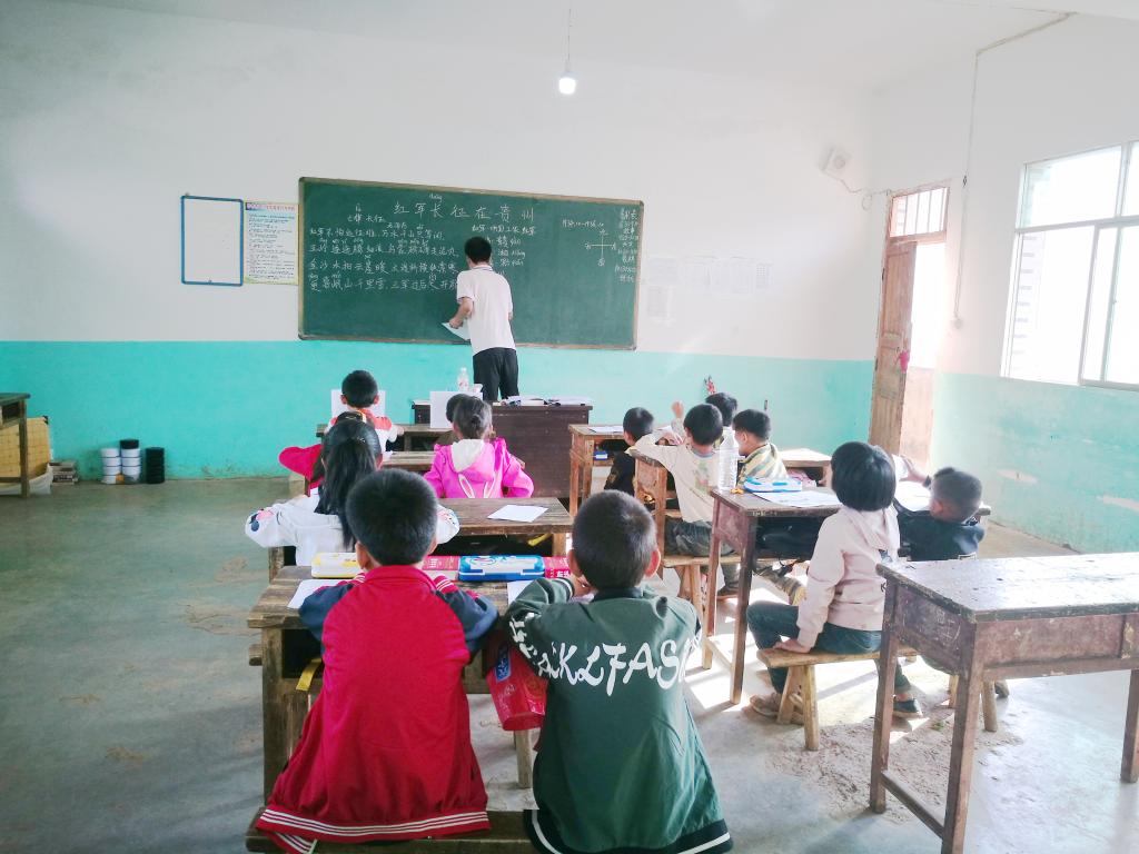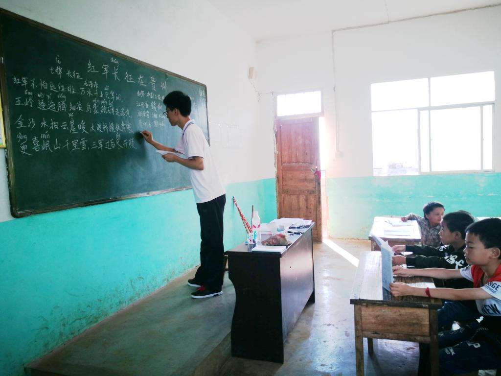 研究生党员曾辉炎在阅读课上为孩子们讲述红军长征的故事。“苦不苦想想红军二万五,累不累想想革命老前辈”,中国的历史在贵州发生了伟大的转折,长征在贵州播下的革命火种,已成为贵州各族人民的精神之钙。曾辉炎通过给孩子们讲长征故事,让孩子们带着坚定的信念和意志去奋斗。