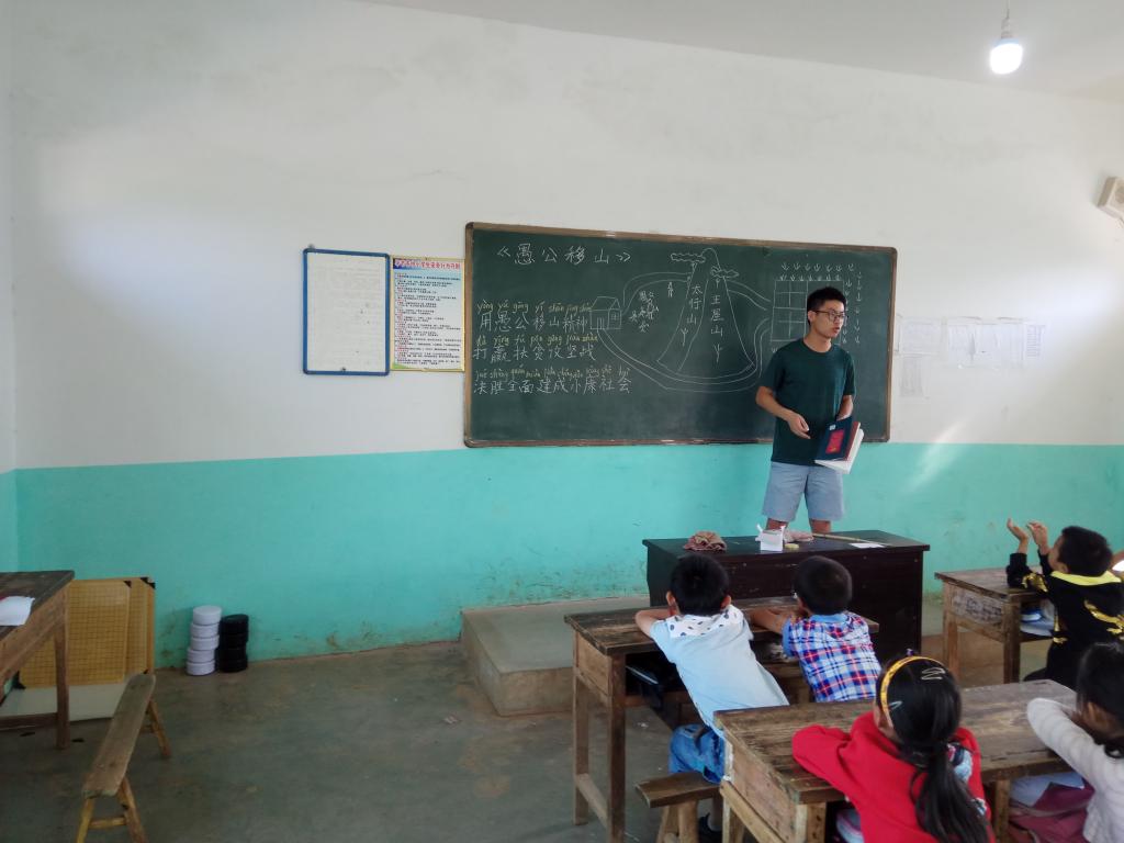 研究生入党积极分子邢泽华向孩子们讲述了《愚公移山》的故事。通过讲故事告诉孩子们树立愚公精神,下定决心,敢于迎难而上,早日走出大山。
