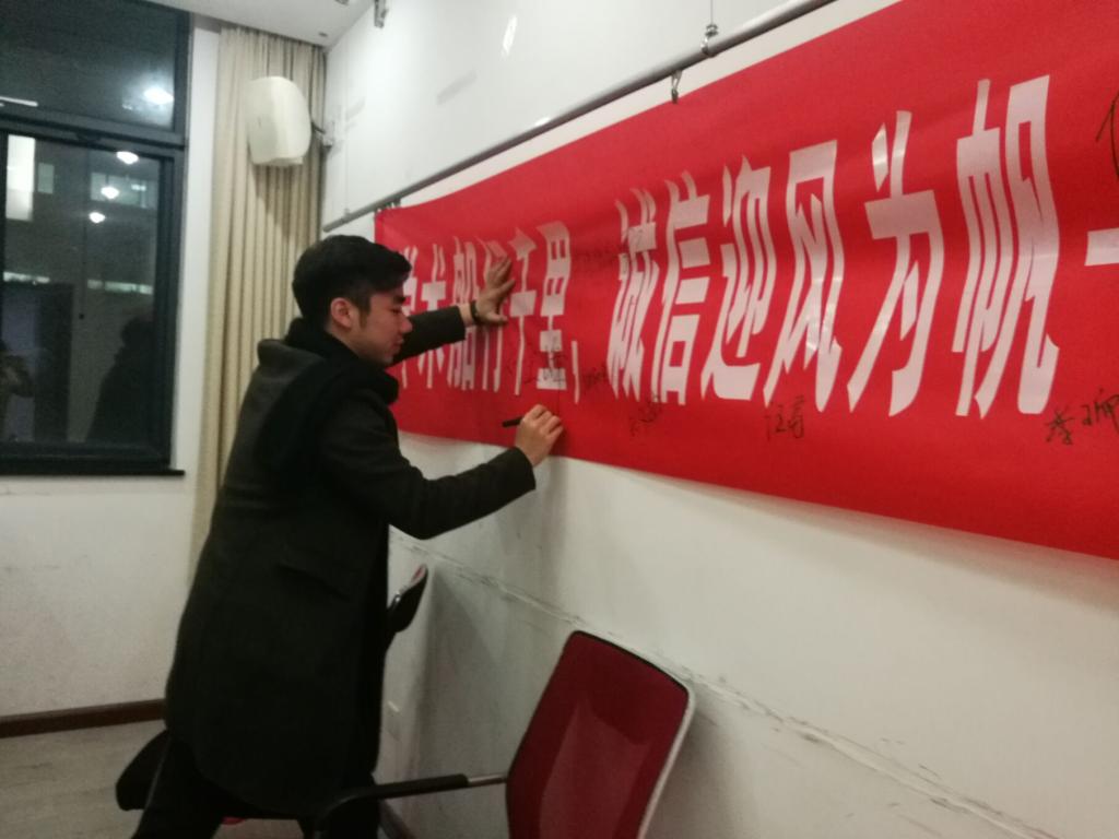 讲座结束时,杨君友院长就赵教授的讲座进行了总结,杨院长鼓励大家在科研求索过程中能大胆探索,勤于动笔,勤于思考,始终以严谨的治学态度努力攻克科研上的每一个难题,永葆初心,在科研路上越走越远。与会全体研究生深受鼓舞,纷纷在本次讲座的“学术船行千里,诚信迎风为帆”的横幅上签上自己的名字,来表达自己不忘初心、认真做好科研工作的决心。