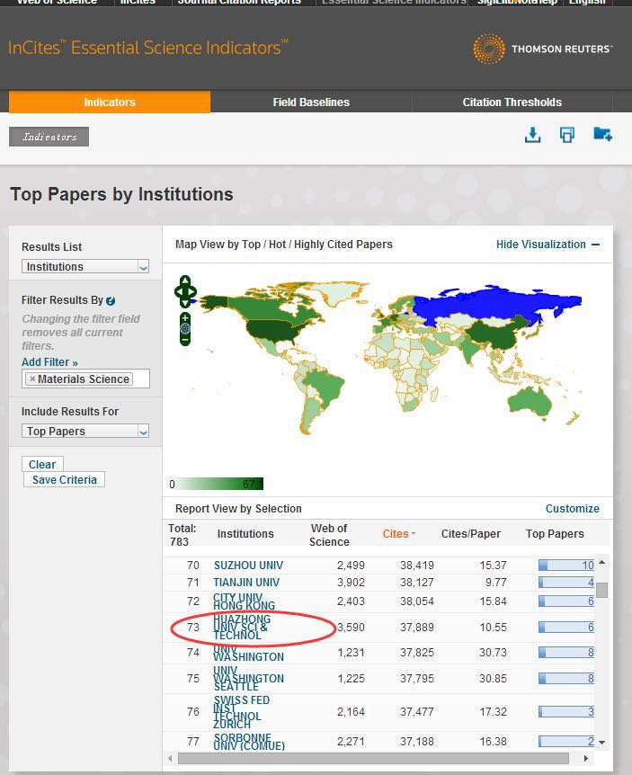 材料学科全球共有783个机构进入ESI 排名,我校排第73名,有63篇高影响论文入选。