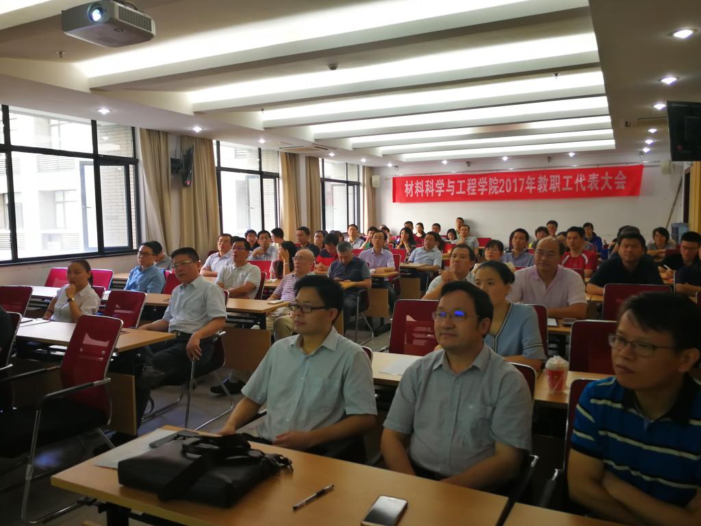 2017年教职工代表大会在材料成形与模具技术国家重点实验室A308报告厅召开。会议以“强基础、建平台,抓人才、创一流”为主题,由学院工会主席王新云主持。