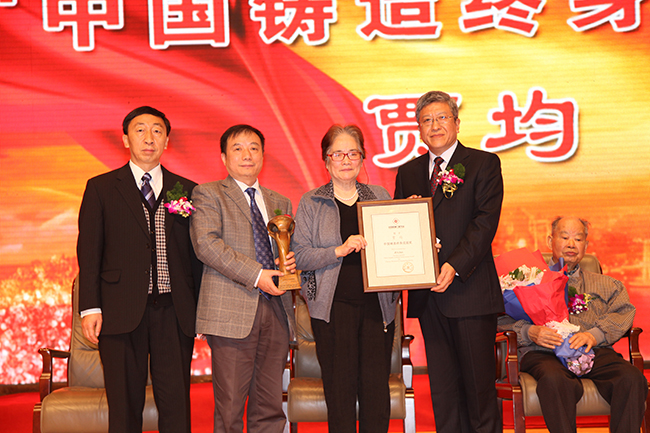 2014年10月26日上午,在“2014中国铸造活动周”上,举行了隆重的第四届“中国铸造终身成就奖”和“中国铸造杰出贡献奖”颁奖典礼。颁奖典礼由中国机械工程学会铸造分会副理事长娄延春主持。在颁奖典礼上,为王文清教授、唐玉林研究员、贾均教授颁发了“中国铸造终身成就奖”奖杯和证书,为曾大本教授、万仁芳先生、唐一林先生颁发了“中国铸造杰出贡献奖”奖杯。颁奖仪式上分别播放了获奖者的获奖视频,嘉宾代表宣读了颁奖词,并为获奖者颁发了奖杯和证书,获奖者分别发表了获奖感言。因贾均教授于10月7日去世,贾均夫人林逸青女士代领了奖杯和证书,并宣读了贾均教授生前所写的获奖感言。