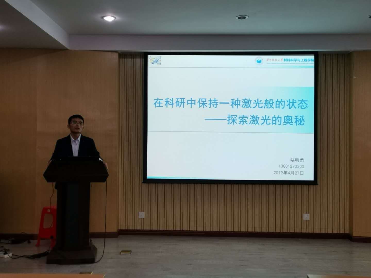 紧接着,蔡明勇博士结合自己的博士生涯,围绕着激光研究和同学们分享他对“在科研中保持一种激光般的状态”的一些思考。蔡博士告诉大家激光是一个无所不能的工具,可以与几乎任意的物质发生相互作用,元素周期表上任意排列组合得到的物质,都可以被激光辐照,激光在各个领域的应用非常广泛。在科研中,我们有着与激光有共性的地方,在科研中保持适当的压力,实现粒子数反转;我们本身就是激光工作物质,在外界激励下,发生受激辐射,并在我们控制下,进一步发生放大,最后爆发出无限的潜力,无坚不摧,无所不能等等。蔡博士表示,材料学科研究不能只注重工艺,还要做到材料、工艺、装备和产品的一体化;国家需求是学科发展的动力,材料学科发展应促进社会进步;要关注当今科学的发展对材料学科的影响。