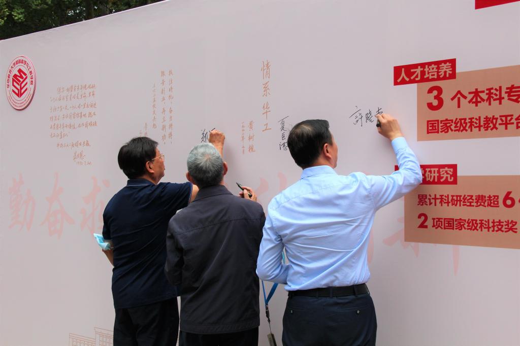 在讲解员代表潘庆玲老师的引导下,全体参加仪式嘉宾、师生代表参观图片展,一张张老照片唤起珍贵回忆,参观者们亲切交流,共忆学院发展之路,参观最后,副校长许晓东、夏巨谌院长、郑恩焰书记签名,全体参加仪式嘉宾合影留念。