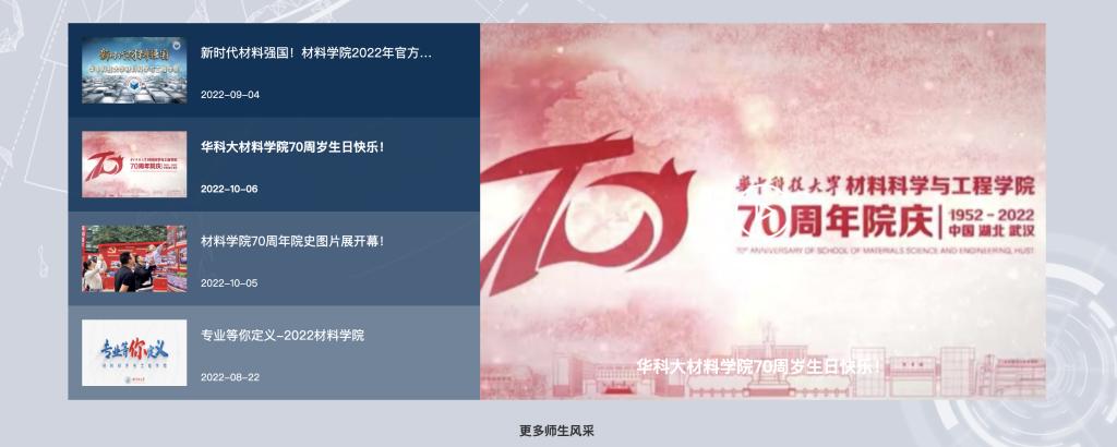宣传建设促院庆,在润物无声中传承开拓。为构建传播新矩阵,学院通过揭榜挂帅项目发动教师,完成2022版宣传PPT制作、学院新网站建设、开通70周年院庆网站。学院加强宣传力度,规划院庆期间整体文化宣传工作,策划拍摄了1支官方宣传片、1支招生宣传片、1支院庆祝福视频、1支图片展视频、1支新春祝福视频、6支院史座谈会视频,若干支院庆大会相关短视频,组织了院庆大会双平台直播等宣传活动,撰写了3篇长文通讯报道学院杰出师者事迹,相关报道屡见于学校相关平台,在师生与校友中收获良好反响。