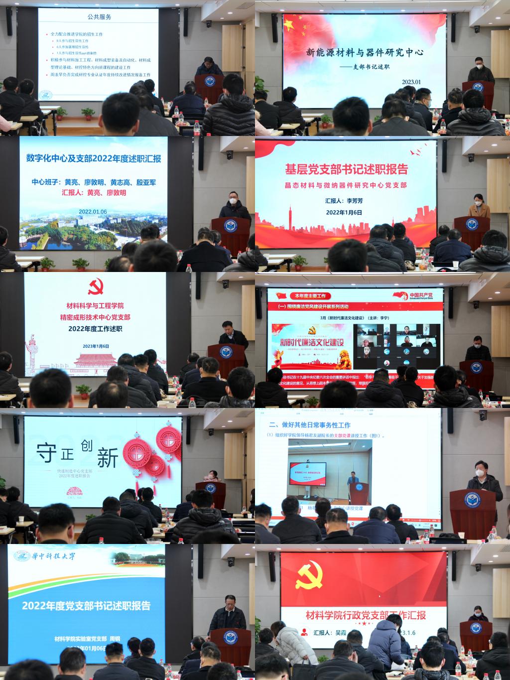 连接与电子封装中心黄安国、新能源材料与器件研究中心李真、数字化成形与模具技术中心黄亮、晶态材料与微纳器件研究中心李芳芳、精密成形技术中心刘鑫旺、新金属材料研究中心张诚、快速制造中心刘洁、半导体材料与器件研究中心黄开金、实验室周钢、机关吴霞,就支部的基本情况、工作重点、问题分析、工作思路及目标等方面进行述职。其中,精密中心支部在学习贯彻党的二十大精神,新金属中心支部在关怀荣休同志,数字化中心支部在动员青年人才向党组织靠拢,半导体中心支部在落实支部功能七个有利方面,行政支部在提升服务师生质量、积极扩大服务范围上均有亮点呈现。