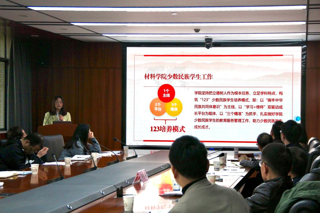 辅导员黄娟老师以“培根铸魂 石榴花开”为题汇报了学院少数民族学生培养的整体情况与工作难点。黄娟重点介绍了学院构筑的以“铸牢中华民族共同体意识”为主线、以“学习+榜样”双驱动成长平台为载体、以“三个精准”为抓手的“123”少数民族学生培养模式。