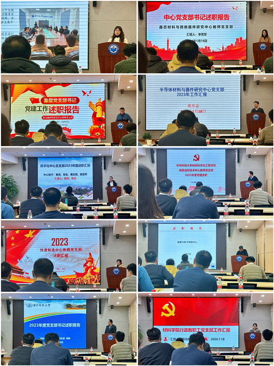 新能源材料与器件研究中心方淳、李箐,晶态材料与微纳器件研究中心李芳芳、李会巧,新金属材料研究中心潘杰、李宁,半导体材料与器件研究中心黄开金、魏璐,数字化成形与模具技术中心黄亮、张云,精密成形技术中心刘鑫旺、董选普,快速制造中心刘洁、闫春泽,连接与电子封装中心黄安国、王春明,实验教学中心周钢、金俊松,机关韩诗禹分别从党建工作、人才培养、教学科研、团队建设、公益服务等方面总结2023年度中心党支部和行政工作,分析了存在的问题,交流了2024年工作打算。2023年,学院各支部、中心认真落实主题教育要求,扎实做好党建基础工作,积极开展支部联学共建、科普宣讲等活动,围绕学院发展目标,在立德树人、科研重大进展、高水平成果产出、人才队伍建设、服务地方经济发展等方面收获新进步,加强文化氛围建设、关心关爱教职工为学院高质量发展提供有力支撑。