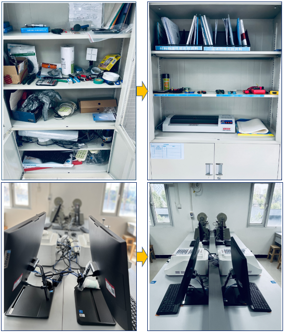 实验室对教学设备和物品开展了系统性梳理:首先全面清理淘汰了闲置、报废及无法修复的设备与杂物,有效释放了空间,显著改善了空间利用率;其次对所有留存物品实施科学分类编码管理,按照使用频率、功能属性等维度建立标准化台账,为后续精细化管理奠定基础。这一举措既解决了历史遗留的"物品堆积"问题,又为5S管理的持续推进提供了数据支撑。