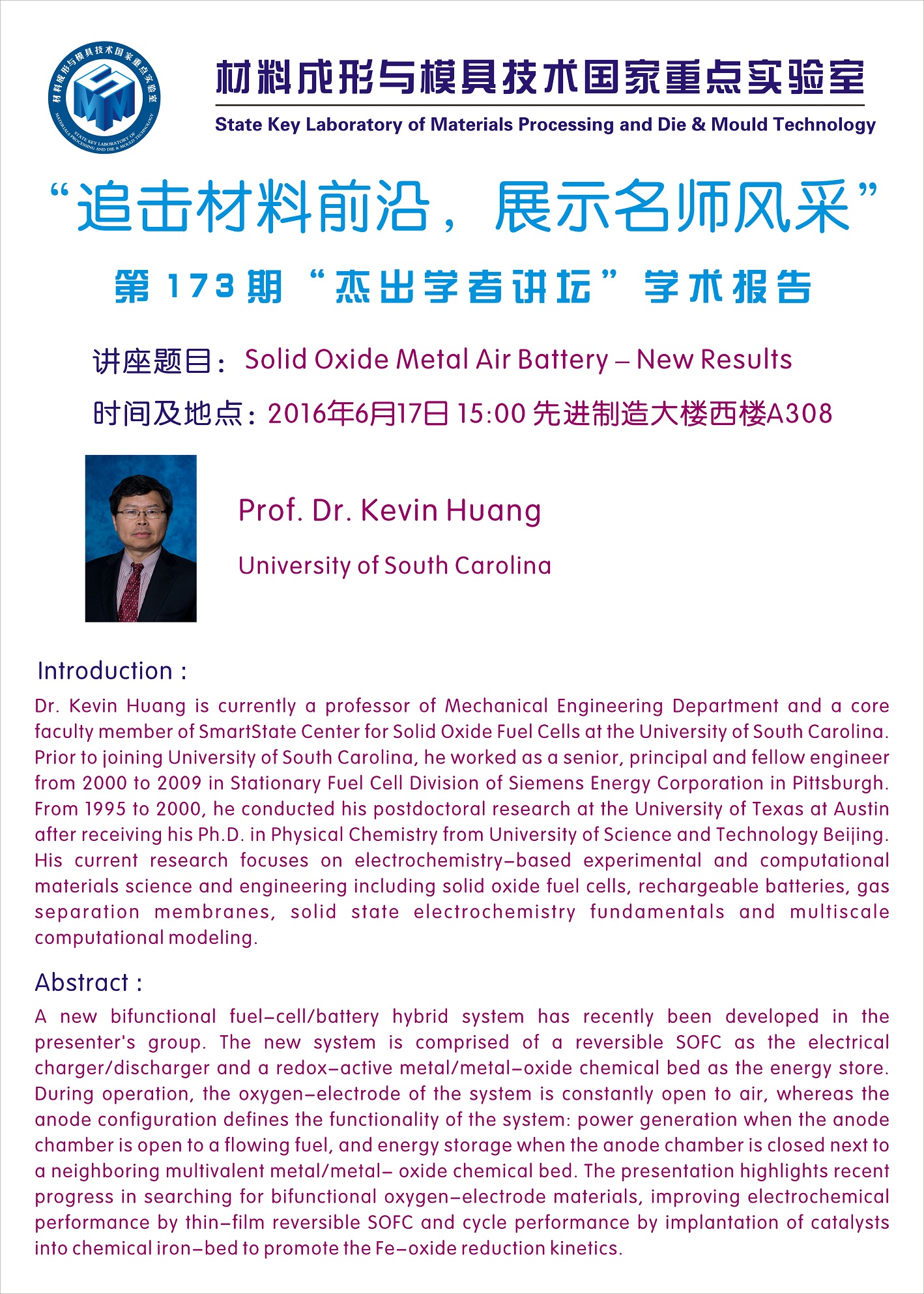 【6月17日】第173期“杰出学者讲坛” 南卡Kevin Huang 教授作关于Solid Oxide Metal Air Battery的学术报告