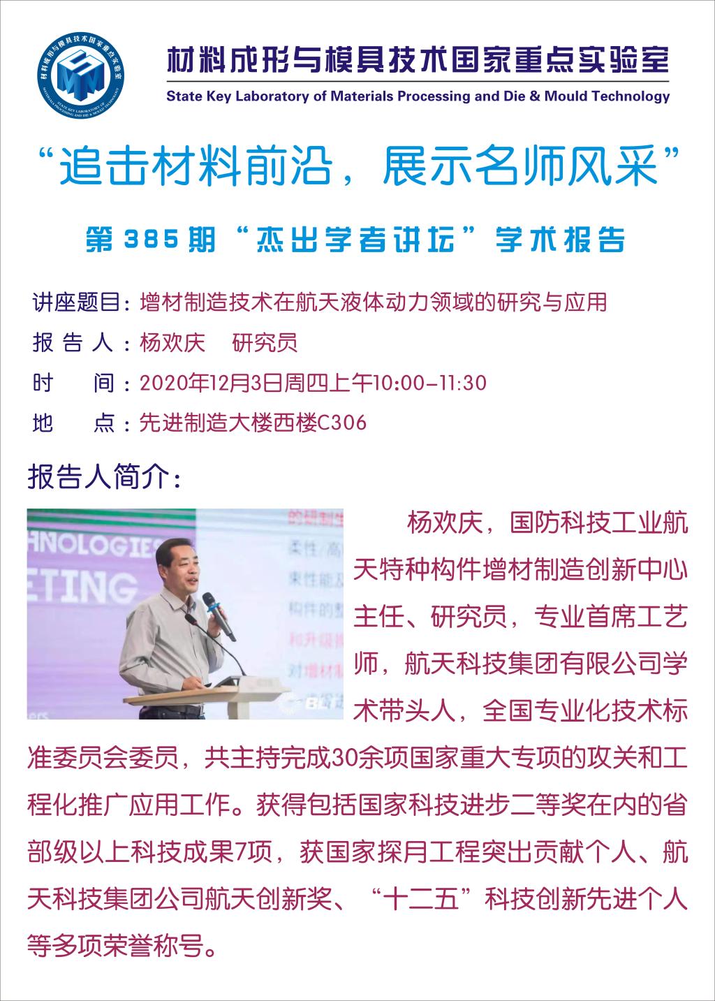 第385期杰出学者讲坛——航天科技集团杨欢庆研究员
