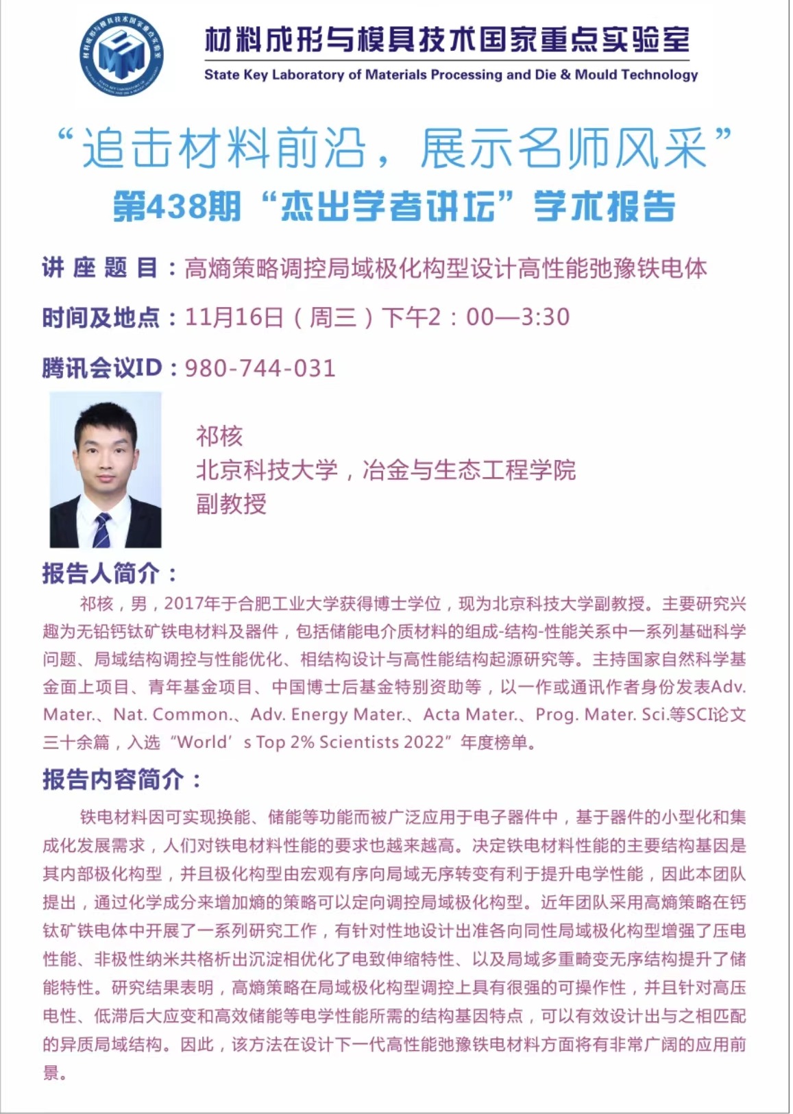 2022年11月16日“杰出学者讲坛”:高熵策略调控局域极化构型设计高性能弛豫铁电体
