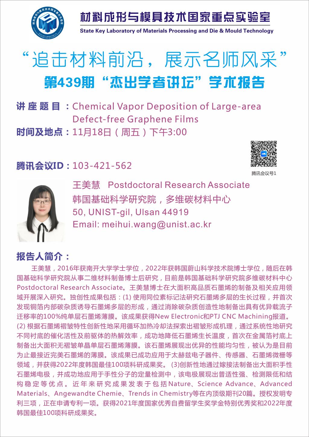 2022年11月18日“杰出学者讲坛”:Chemical Vapor Depostion of Large-area Defect-free Graphene Films