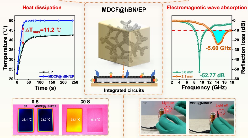 图3. MDCF@hBN/EP的散热性能和电磁波吸收性能