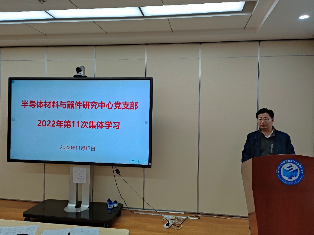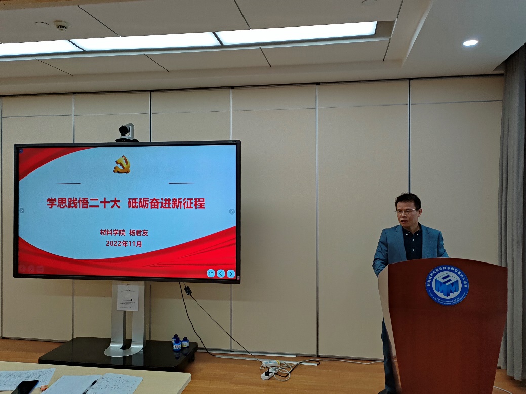 2022年11月17日下午,半导体材料与器件研究中心党支部2022年第11次集体学习会议在先进制造大楼A310顺利召开。本次会议由中心党支部书记黄开金老师主持,杨君友副院长讲授“学思践悟二十大 砥砺奋进新征程”专题党课,内容涵盖了“二十大概况”、“过去五年新时代十年成就”、“从现在起党的中心任务”和“五个必由之路”等内容。