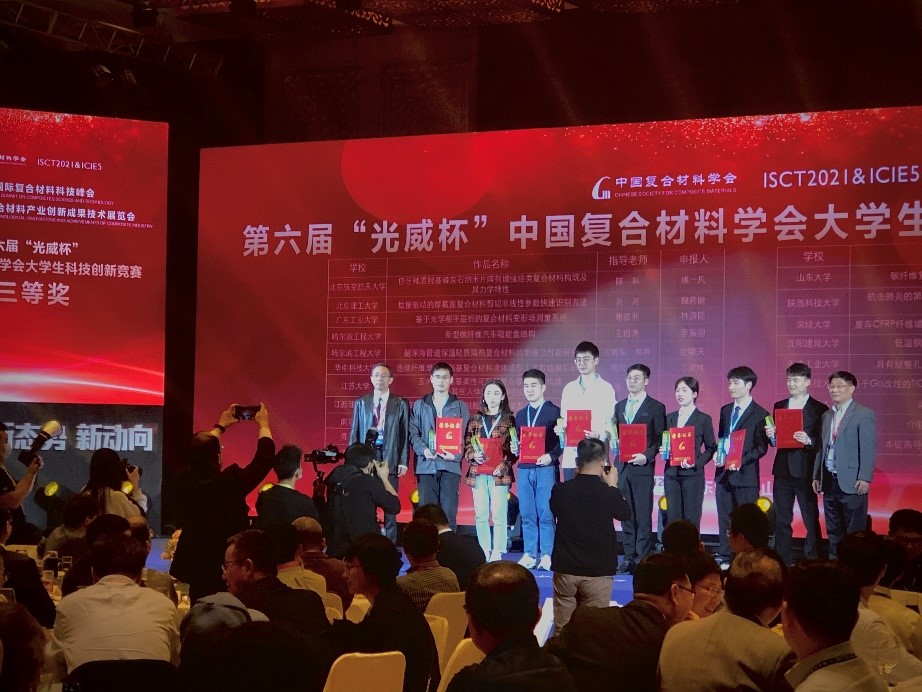 2021年12月11-13日,第六届“光威杯”中国复合材料学会 大学生科技创新竞赛总决赛在东莞松山湖凯悦酒店举行。在周何乐子老师指导下,中心研究生丁浚纯、李先阳、张牧寒、林浩坤、陆兴等同学的参赛项目“连续纤维增强树脂基复合材料液体成形工艺数值模拟研究”经过半决赛线上评审、现场分组答辩,获得全国总决赛三等奖。