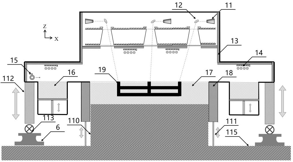 11-激光器,12-振镜,13-保温层,14-加热装置,15-铺粉刮板,16-铺粉缸,17-成形缸,18-成形缸缸壁,19-成形形坯,110-成形台面,111-成形缸缸壁升降装置,112-SLS设备升降装置,113-导轨轮,6-导轨,115-地面