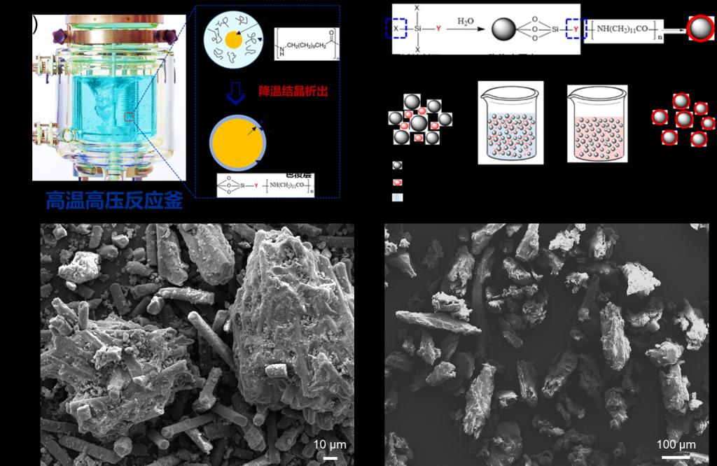 (a)蒸馏冷却均匀降温控制方法;(b)溶剂沉淀制备方法;(c)酚醛树脂包覆碳纤维复合粉体;(d)酚醛树脂包覆木纤维复合粉体