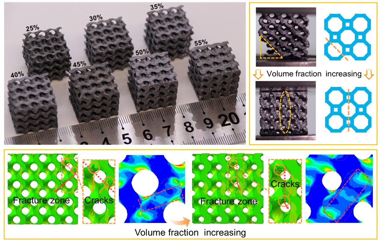 在碳化硅极小曲面点阵结构应用方面:通过激光粉末床熔融技术结合液相渗硅反应烧结工艺成形出碳化硅极小曲面点阵结构,对碳化硅点阵结构的制造、力学性能等进行了系统研究(图9)。该碳化硅点阵结构具有较高的制造精度和较低的收缩率(小于6%),建立的有限元模拟模型可以准确地验证和预测碳化硅极小曲面点阵结构的力学和断裂行为(大多数偏差小于20%)。此外,采用理论模型与有限元模拟结合的方式阐明了体积分数对碳化硅极小曲面点阵结构压缩断裂带的影响机制,为优化碳化硅极小曲面点阵结构的设计和3D打印提供了重要理论指导。【Addit. Manuf. 56 (2022) 102910】