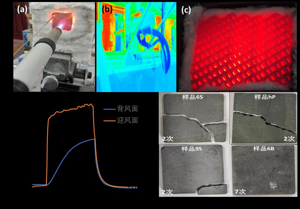 (a)抗热冲击测试(升温);(b)抗热冲击测试(降温);(c)高温多孔SiC构件;(d)热冲击测试温度曲线;(e)不同3D打印SiC样件1300℃~室温急冷急热循环后的宏观形貌