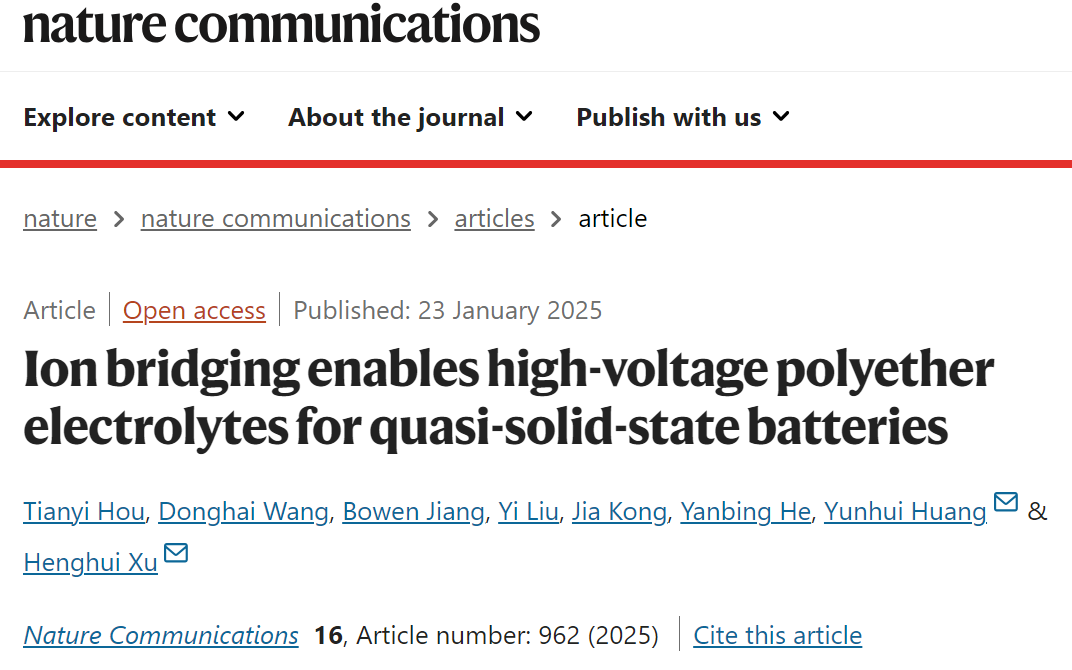 (通讯员 侯添壹)1月23日,《自然·通讯》(Nature Communications)在线刊发我校魔性论坛 黄云辉和许恒辉教授研究成果:离子桥联策略实现高压聚醚电解质用于准固态电池“…